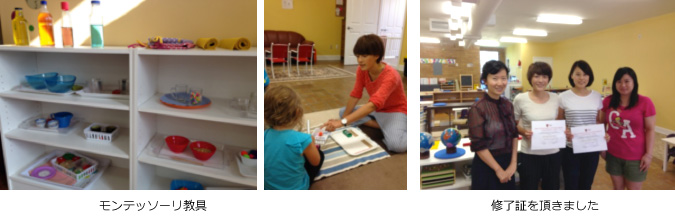 滞在中に4回ワークショップがありました。テーマは、幼児教育の基本、モンテッソーリ教育、サークルタイム、フェルトシアターでした。 現地の先生方と情報や意見の交換ができ、とても有意義な内容でした。特に、フェルトシアターを自分たちで作るワークショップが一番楽しかったです。 また、サークルタイムは、実際にデイケアの保育時間を15分程担当させてもらい、日本の「桃太郎」をパペットショーで紹介しました。子ども達はとても喜んでくれて、 現地の先生方にも好評でした。モンテッソーリ教育については、私は知らない事が多く、大変勉強になりました。身近な材料で作れそうな教具がたくさんあったので、遊びの一つとして取り入れる等、 プリスクールでの仕事に活かしていきたいと思います。