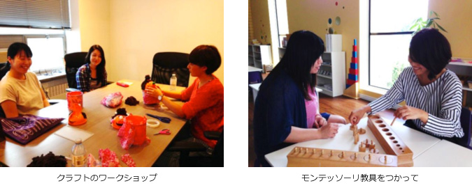 滞在中に4回ワークショップがありました。テーマは、幼児教育の基本、モンテッソーリ教育、サークルタイム、フェルトシアターでした。 現地の先生方と情報や意見の交換ができ、とても有意義な内容でした。特に、フェルトシアターを自分たちで作るワークショップが一番楽しかったです。 また、サークルタイムは、実際にデイケアの保育時間を15分程担当させてもらい、日本の「桃太郎」をパペットショーで紹介しました。子ども達はとても喜んでくれて、 現地の先生方にも好評でした。モンテッソーリ教育については、私は知らない事が多く、大変勉強になりました。身近な材料で作れそうな教具がたくさんあったので、遊びの一つとして取り入れる等、 プリスクールでの仕事に活かしていきたいと思います。
